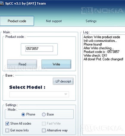 Для смены product code Nokia также можно использовать программу ANT-SpCC.