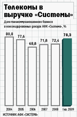 Доля телекоммуникационного бизнеса в выручке АФК «Система» достигла в I квартале 2009 г. самого высокого значения за последние пять лет — 78,3%. В условиях кризиса это плюс, считают аналитики