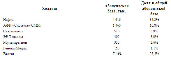 По оценкам iKS-Consulting, на 1 апреля 2007 года число абонентов операторов кабельного ТВ в России достигло 13,51млн. Уже более половины (почти 7,5 млн) абонентской базы КТВ контролируется 6 крупнейшими холдингами. Для сравнения: на конец 2005 года их суммарная абонентская база составляла чуть более 6,5 млн. 15%-процентный ростабонентской базы холдингов был в основном обеспечен агрессивным развитием «Эр-Телекома» и региональными приобретениями СММ/АФК «Система» (СТРИМ-ТВ).