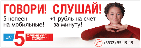 Региональный оператор ЗАО «Оренбург-GSM» продолжает рекламную кампанию «Шаги навстречу». 15 октября 2007 г. стартовал очередной этап кампании – «Шаг 5 – ГОВОРИ за 5 копеек, СЛУШАЙ за РУБЛЬ!». Акция проводится с 15 октября до 15 декабря 2007 г. для абонентов, имеющих федеральный номер на тарифном плане «ON-56», а также на других тарифных планах предоплатой системы расчётов.