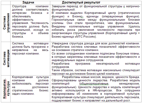 Представленный проект является составляющей частью общей стратегии повышения эффективности бизнеса МТС. Изменения коснулись трех направлений: системы управления, системы мотивации, корпоративной культуры.