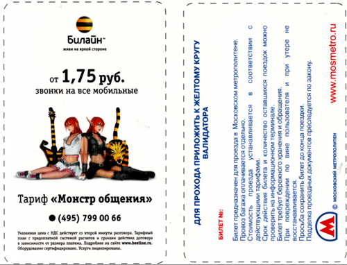 Не бесспорный по эффективности вид рекламного носителя будет использован в новой рекламной кампании оператора - проездные билеты московского метро. С 16 сентября во всех кассах московского метрополитена в продаже должны появиться билеты на 1, 2, 5, 10, 20, 60 поездок с изображением персонажей рекламы ТП «Монстр общения».