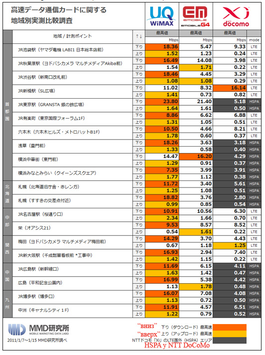 MMD Institute представляет сравнительный анализ скорости работы нескольких сетей мобильного ШПД Японии. В исследовании измерялись скорости в WiMAX сети UQ Wireless (подразделении оператора KDDI), в DC-HSDPA сети оператора EMOBILE G4 и в сетях NTT DoCoMo (сеть LTE Xi, сеть 3G/HSPA DoCoMo).