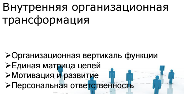 Вертикаль начала работать только после того, как были поставлены "сквозные" цели, причем цели распространялись как по функциональной вертикали, так и захватывали вовлеченные подразделения. Что также важно в эту целевую матрицу попали также руководители технических подразделений наших операционных единиц - филиалов и региональных управлений. На мой взгляд, это стало основой, платформой всех последующих успешных изменений, которые мы осуществили в рамках реализации стратегии.