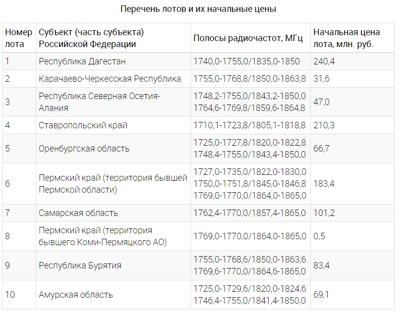 Tele2 (1082,84 млн руб, начальная цена лота - 101,2 млн руб.). Частоты будут задействованы под GSM и LTE