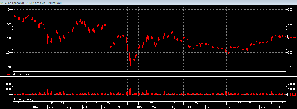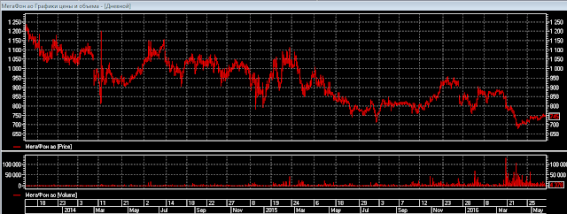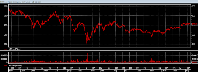 Посмотрим на МТС, биржевая стоимость обыкновенных акций компании за этот период сократилась на четверть. Провал в декабре 2014 года связан с арестом г-на Евтушенкова, как известно.