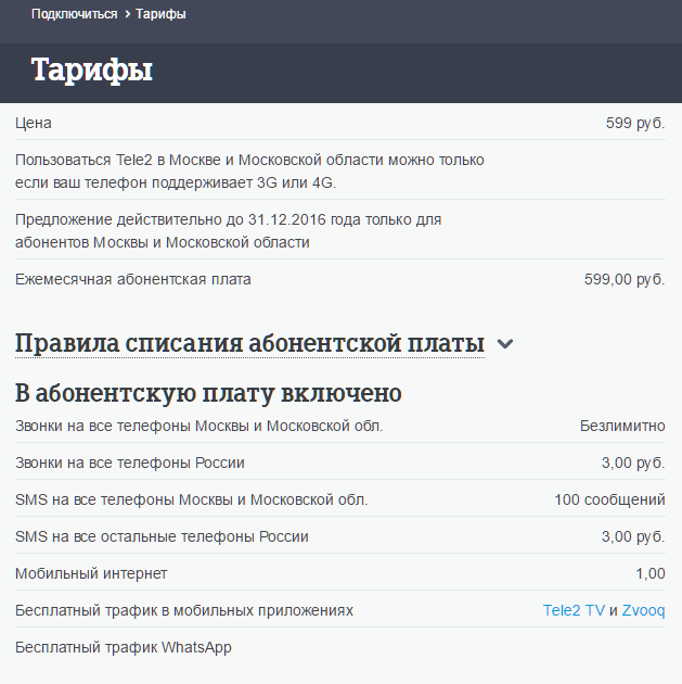 Все вышеперечисленное, а также возможность звонить на все телефоны России по 3 рубля в минуту обойдутся клиенту в 599 рублей в месяц - любителям пообщаться по телефону, которые сейчас тратят на связь по тысяче и более рублей в месяц предложение Tele2 сулит ощутимую экономию.