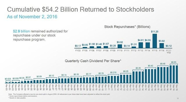 Возвращаясь к дивидендам, Qualcomm наращивает сумму их выплат вот уже 13 лет подряд. И несмотря на сокращение доходов в 2016 году, компания сочла возможным увеличить выплаты дивидендов на 10% - может ли это свидетельствовать о том, что в компании уверены в хороших перспективах ее дальнейшего развития? Не стоит забывать и о том, что Qualcomm ежегодно тратит миллиарды долларов на выкуп части акций, что позитивно влияет на рост стоимости бумаг этой компании.