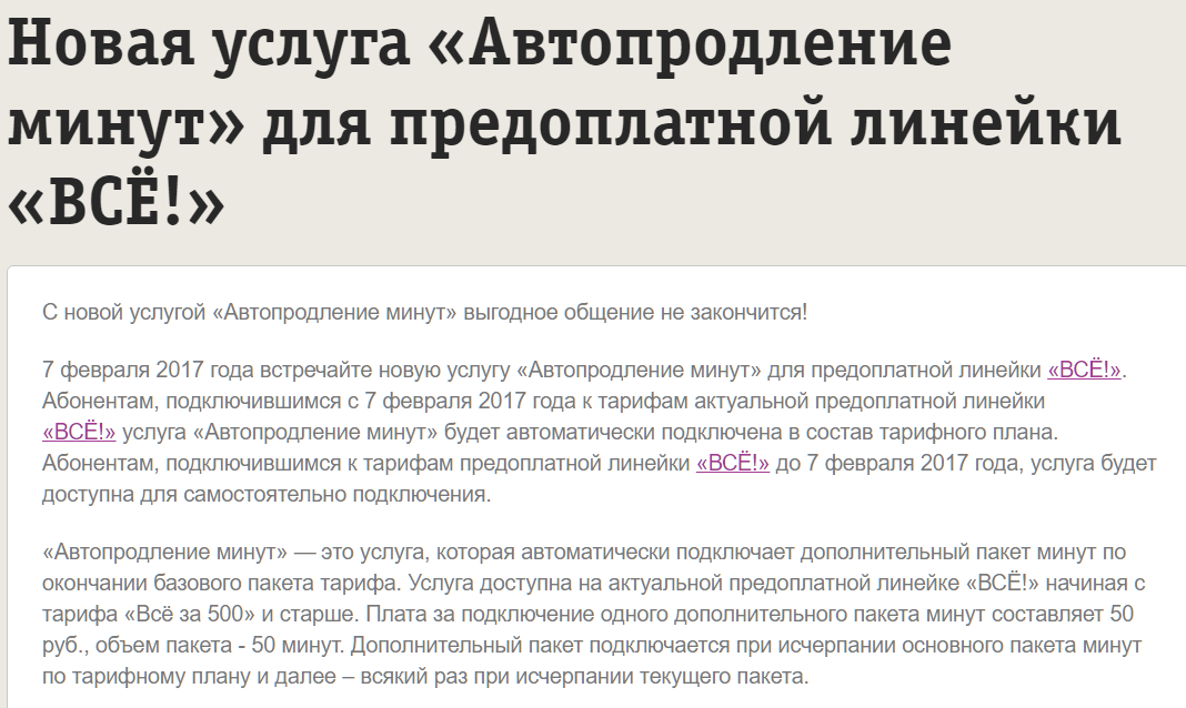 Цена минуты в пакете - 1 рубль, списание за пакет - 50 рублей (в пакете 50 минут). Все, кто подключится к предоплатным тарифам "Всё" после 7 февраля, услугу "Автопродление" получат автоматом.