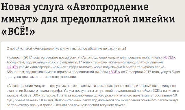 Суть услуги "Автопродление минут": автоматическое (!) подключение дополнительного пакета минут по окончании базового пакета тарифа. Услуга доступна для тарифов "Всё за 500" и старше. После исчерпания дополнительного пакета также автоматически подключится и следующий доппакет.