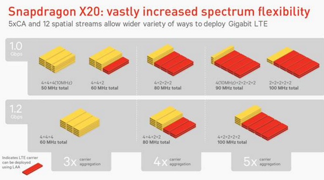 Если Snapdragon X16 поддерживал всего две конфигурации, обеспечивающие достижения гигабитных пиковых скоростей, то Snapdragon X20 поддерживает 8 конфигураций, благодаря поддержке самых разных вариантов агрегации частот, вплоть до 5xCA и 4x4 MIMO.