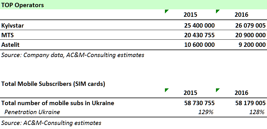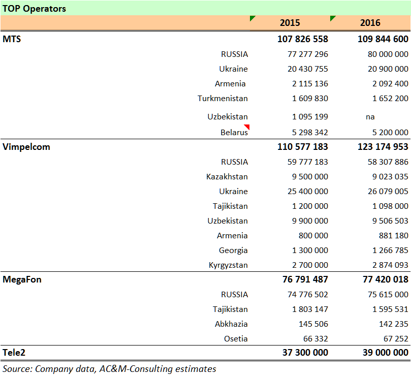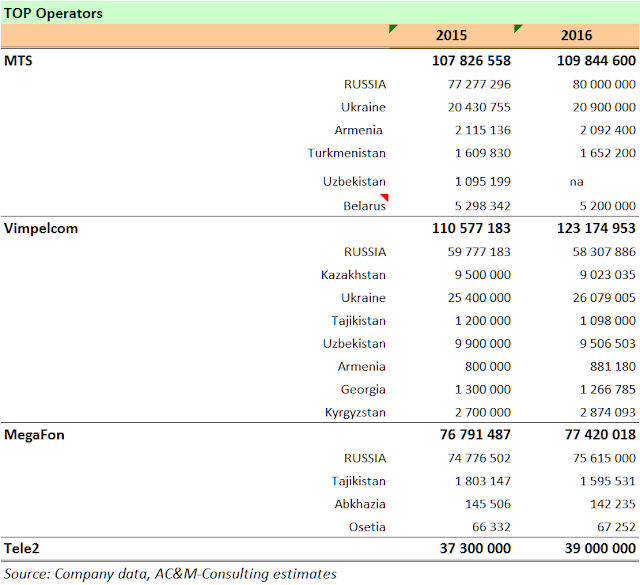 Оценки числа абонентов сотовой связи в значительной степени потеряли былую значимость. Тем не менее, это одна из характеристик, по которым удобно сравнивать операторов всем, кто смотрит на ситуацию снаружи и издали. Агентство AC&M представляет свои оценки числа подключений по состоянию на конец 2016.