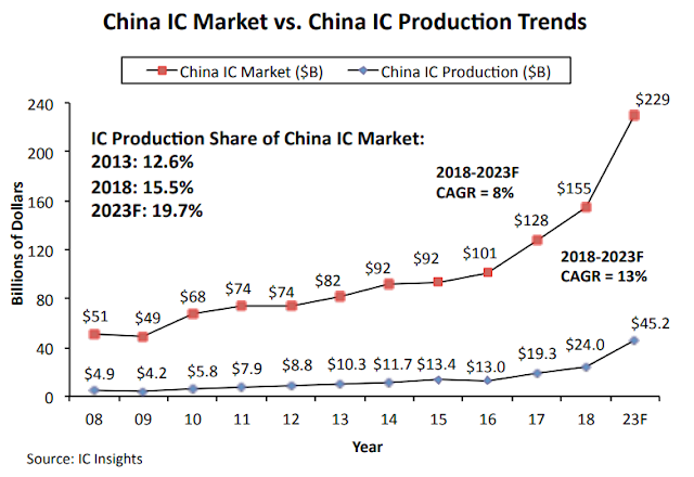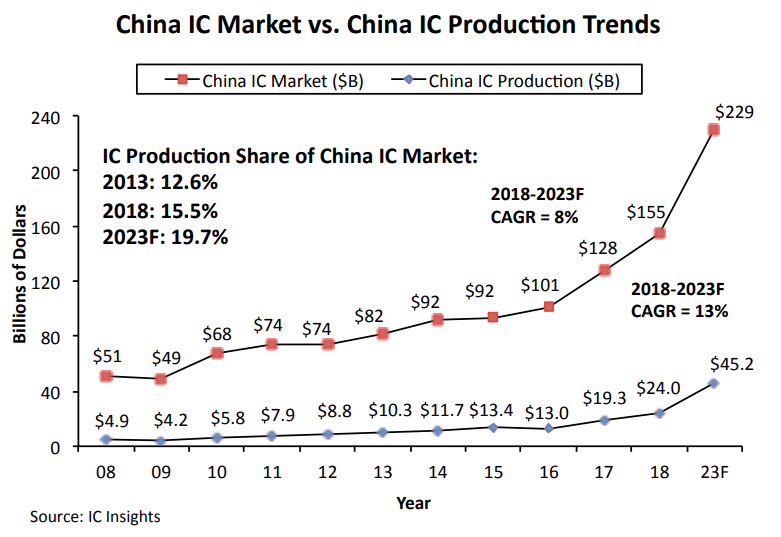 Тарифная война с США и рост спроса на микроэлектронную продукцию на внутреннем рынке заставляет Китай масштабировать планы внутреннего производства ИМС. Но насколько реально справиться с задачей. В IC Insights не верят в возможности Китая решить поставленные задачи.
