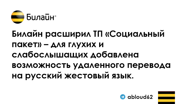 26 июля 2019 года, Москва - ПАО «ВымпелКом» (бренд Билайн) расширил возможности тарифного плана «Социальный пакет» для людей с особыми потребностями. Для глухих и слабослышащих пользователей тарифа появилась функция удаленного перевода на русский жестовый язык (РЖЯ).