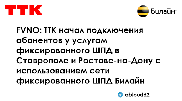 В рамках программы Fixed Virtual Network Operator (FVNO) начались подключения абонентов ТТК к услуге ШПД, организованной на базе сетей Билайн в Ростове-на-Дону и в Ставрополе.