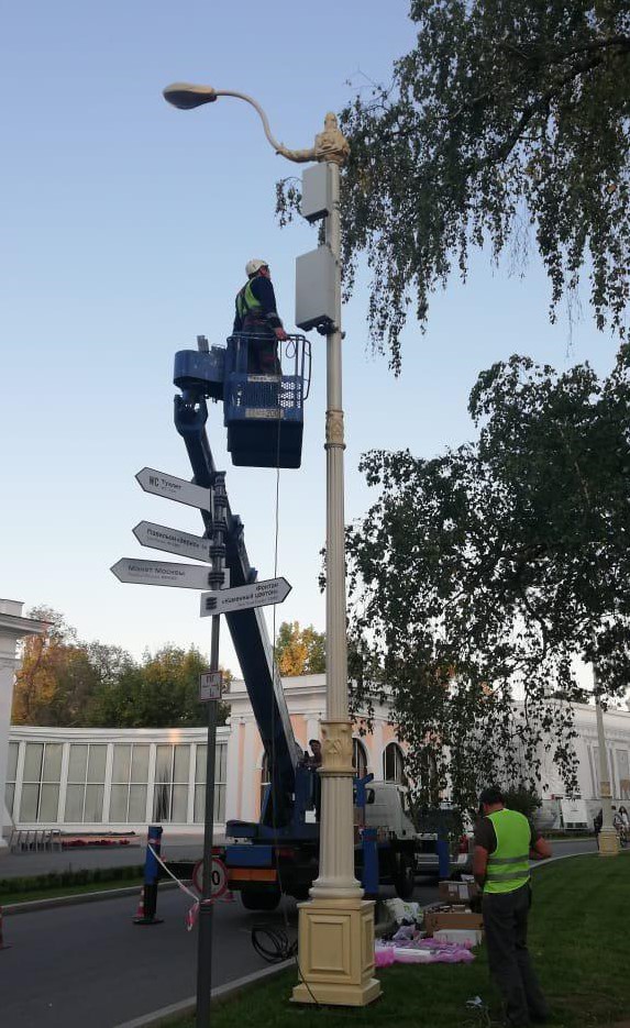 Монтаж радиооборудования 5G МТС на фонарном столбе (опоре двойного назначения) на ВДНХ