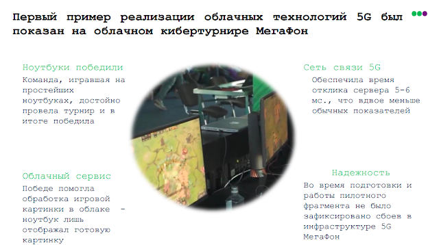 Как это стало возможным? В облаке формировалась картинка (видеопоток), сеть 5G обслуживала быструю доставку соответствующего видеопотока из облака на ноутбуки, а команд управления с клавиатуры ноутбука в облако. Задержки, по словам г-на Темирова, составляли от 4 мс до 6 мс. В результате профессионалы победили, несмотря на то, что использовали ноутбуки. Ноутбуки, подкрепленные облачными серверами, подкрепленные 5G. За все время работы этого пилотного проекта мы не зафиксировали ни одного сбоя на инфраструктуре сети МегаФон. Это продемонстрировало реалистичность применения 5G геймерами с их жесткими требованиями к каналу связи.