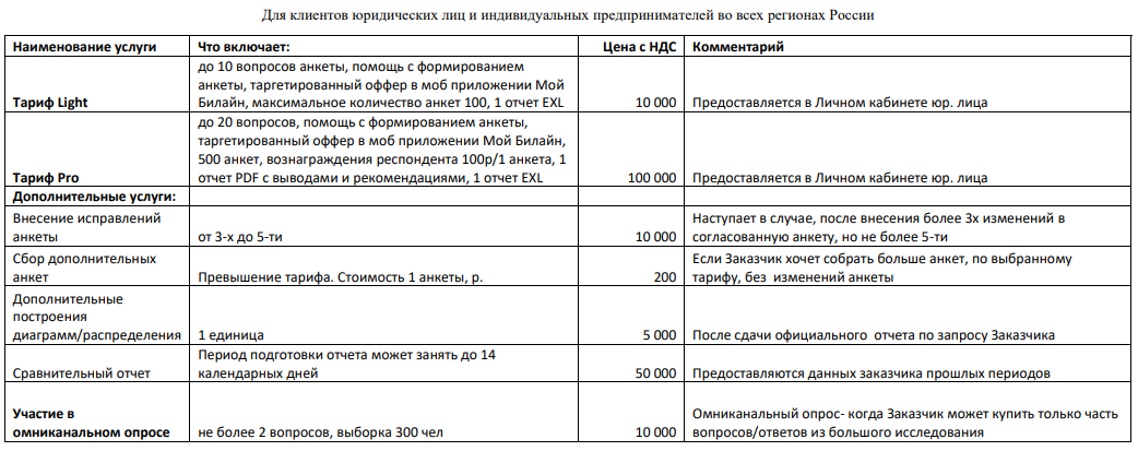 В рамках сервиса маркетологи-аналитики Билайн обещают постоянную поддержку заказчикам, включая помощь в формулировании вопросов для анкеты, а также в правильной интерпретации полученных данных. По завершении опроса специалисты компании в течение 72 часов готовят и размещают в личном кабинете пользователя обезличенный аналитический отчет в форматах PDF или EXCEL. Документ содержит графические приложения, а также выводы и рекомендации, изложенные в доступной форме.