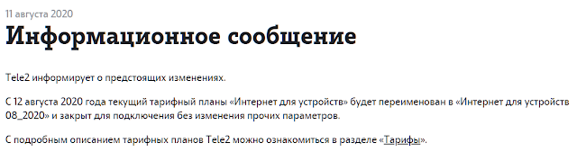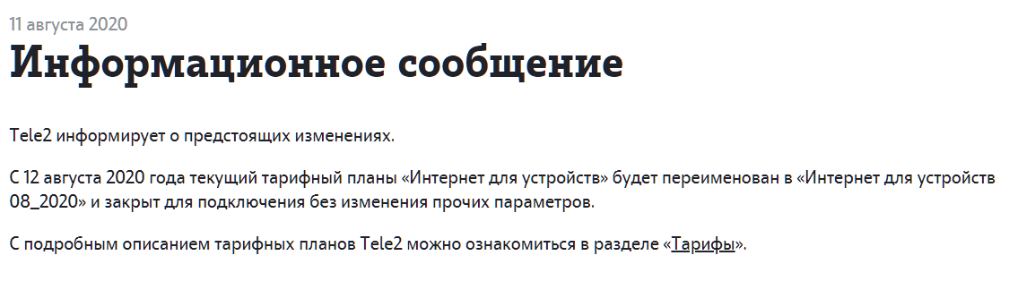 С 12 августа компания переименовывает текущий тарифный план "Интернет для устройств" в "Интернет для устройств 08_2020" и закрывает его для подключения без изменения прочих параметров.