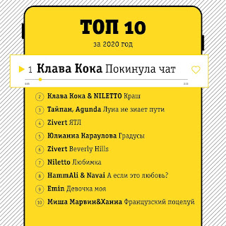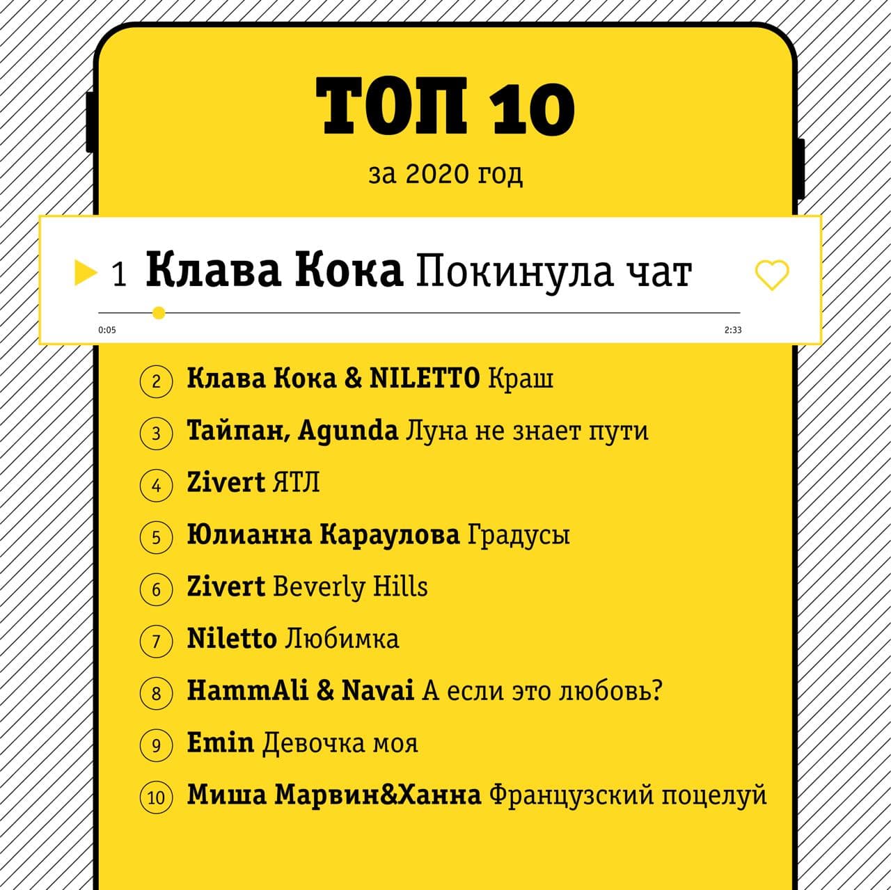 Топ-10 самых прослушиваемых хитов в сервисе «Музыка Билайн» возглавила певица Клава Кока с треком «Покинула чат», второе место занял дует Клавы Кока с NILETTO с треком «Краш», третье место – у курской группы Тайпан и певицы из Владикавказа Agunda с треком «Луна не знает пути». На четвертом месте певица Zivert с «ЯТЛ», а на пятом – Юлианна Караулова с треком «Градусы».