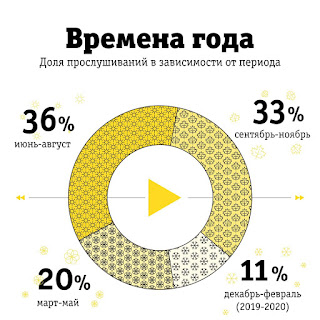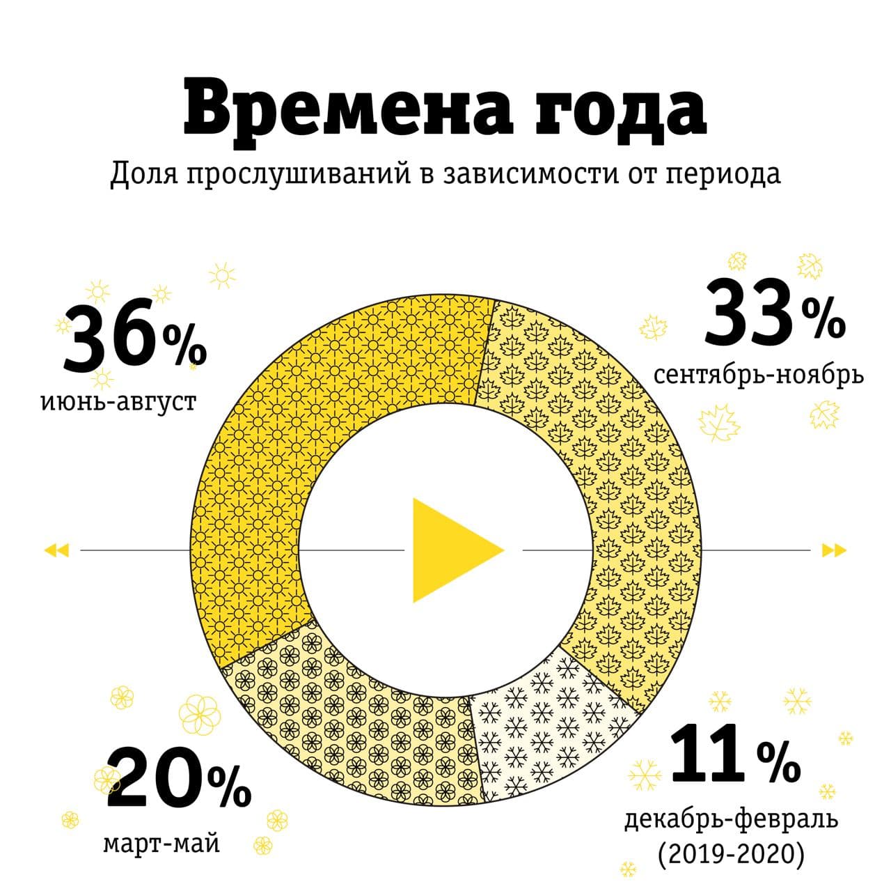 При этом основной пик прослушивания пришелся на лето (+36%) и осень (+33%) 2020 года, чуть меньше пользователи сервиса включали музыку весной (около 20%), и еще меньше – в начале 2020 года (11%). В ходе исследования также выяснилось, что чаще всего музыку пользователи сервисов предпочитают слушать в будни, чуть реже в выходные дни.