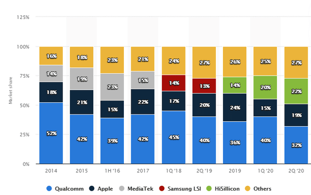 В итоге Qualcomm удается стабильно поддерживать свою лидерскую долю рынка на рынке процессоров для смартфонов и позицию #1. MediaTek при этом в последние 3 года остается в группе "другие", существенно уступая по доле рынка не только Qualcomm, но также Apple и HiSilicon.
