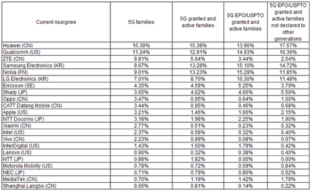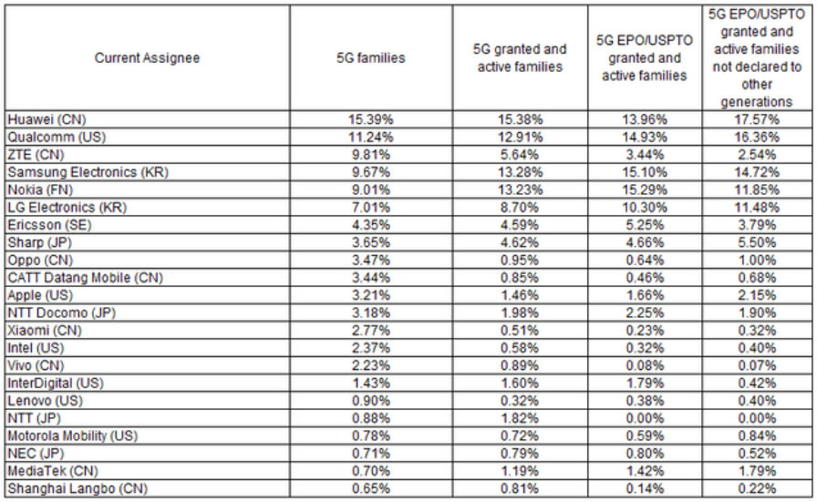 По части патентов 5G MediaTek вообще находится где-то в хвосте списка основных их держателей.