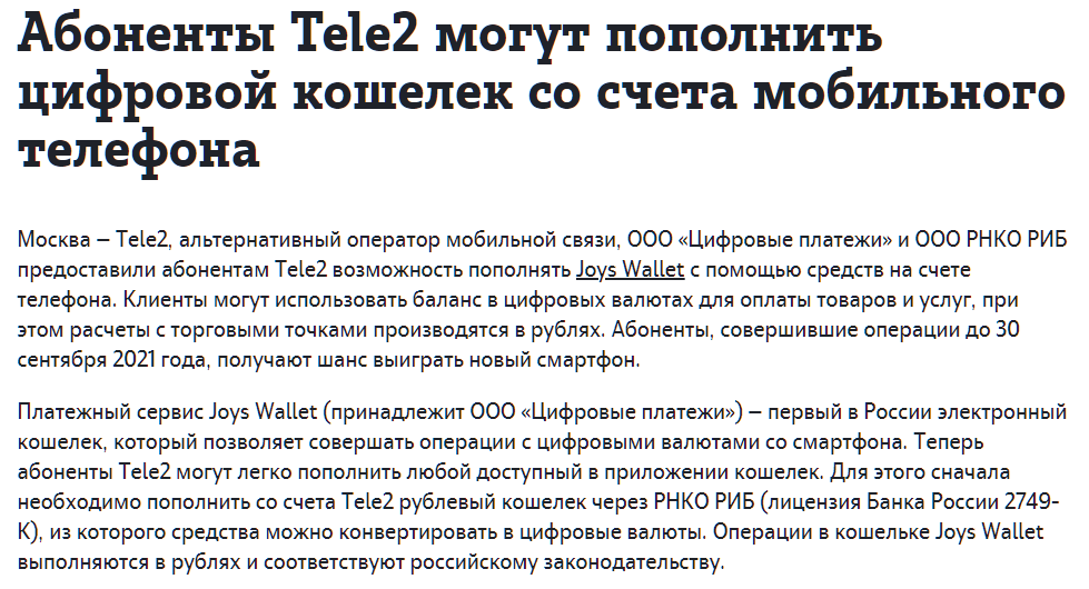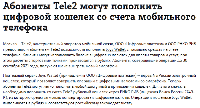 Еще только вчера Tele2 рекламировал новую услугу - возможность пополнения деньгами со счета телефона сервиса цифрового кошелька Joys Wallet.