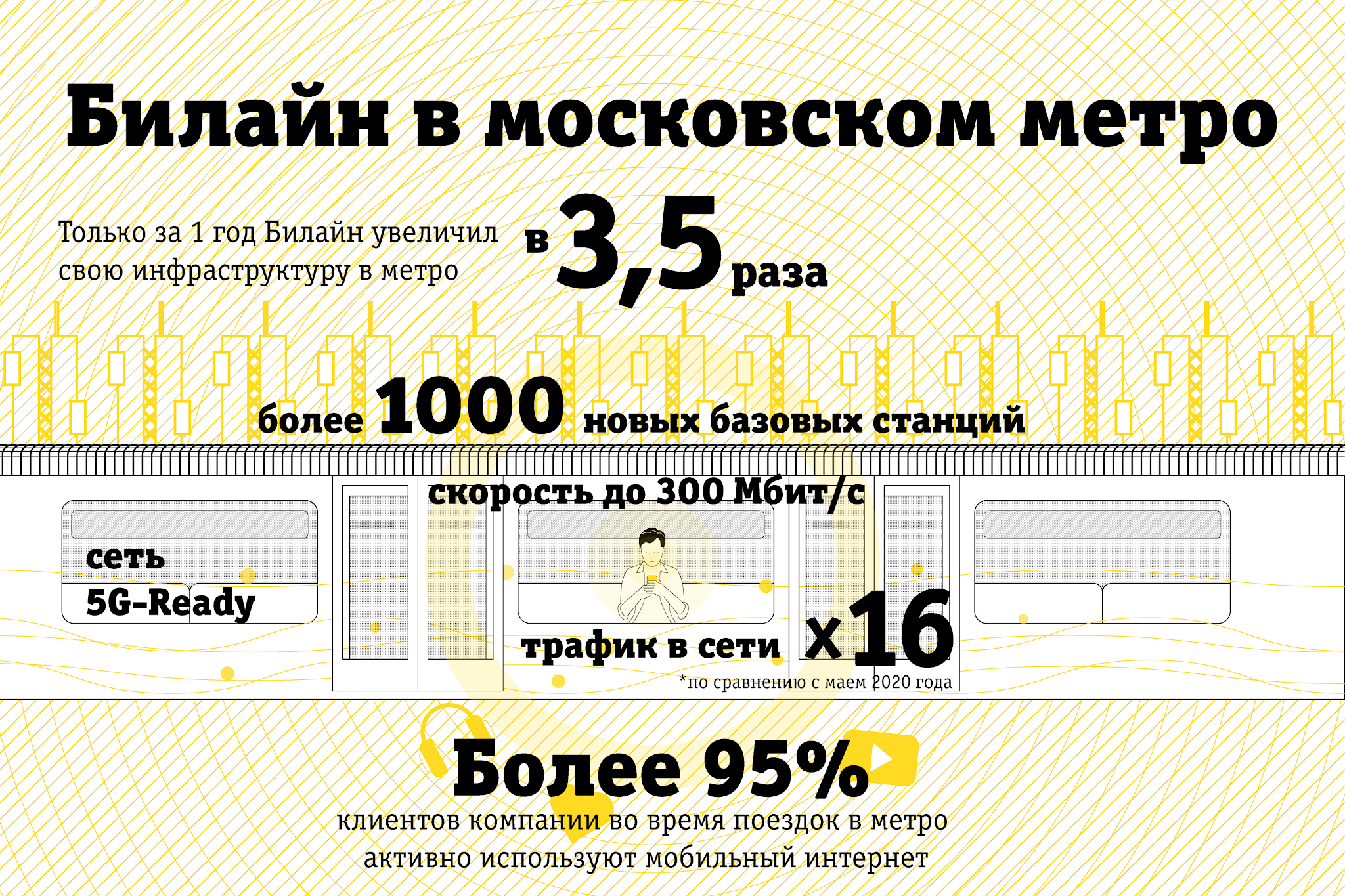 За 1 год Билайн нарастил инфраструктуру сети в метро в 3.5 раза, построив более 1000 новых базовых станций. Мобильный трафик в сети за период 2020.05-2021.05 вырос в 16 раз. Более 95% клиентов компании, попадая в метро, используют мобильный интернет для просмотра видео, общения в соцсетях или чтобы слушать музыку.