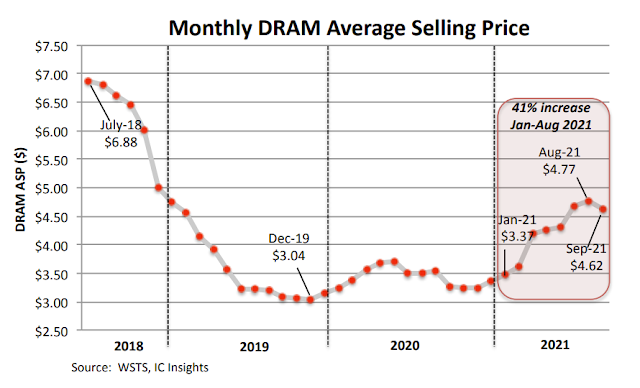 Покупатели памяти DRAM осторожно относились к размещению больших заказов, вместо этого они предпочитают тщательно управлять запасами. При этом цены на DRAM за первые 8 месяцев 2021 года выросли на 41%, поднявшись с $3.37 в январе до $4,77 в августе 2021 года.