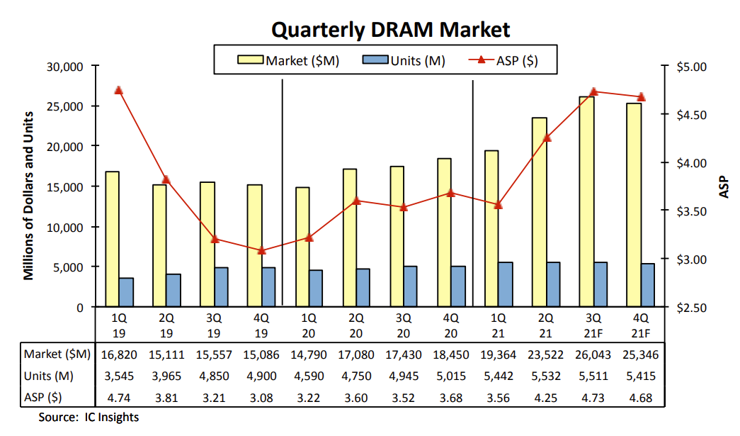 Несмотря на глобальный дефицит чипов, IC Insights прогнозирует, что после значительного роста цены на DRAM по итогам 4q2021 снизятся.