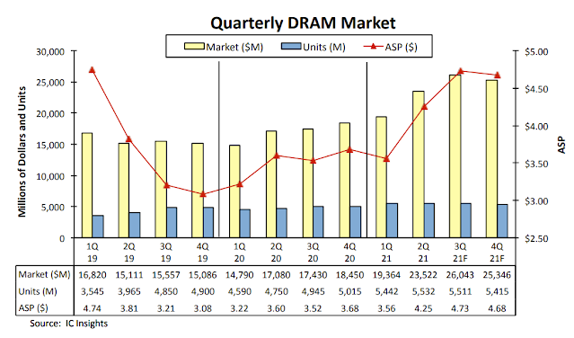 На рисунке показана квартальная динамика рынка DRAM. Нетрудно заметить, что в 3Q2021 фиксируется самый высокий уровень средних цен, что при сравнительно стабильно-высоком уровне объема поставок чипов в штуках привело к рекордно высокому за период объему поставок в деньгах. Возможно в 4q2021 процесс "возгонки" цен остановится, хотя бы временно.
