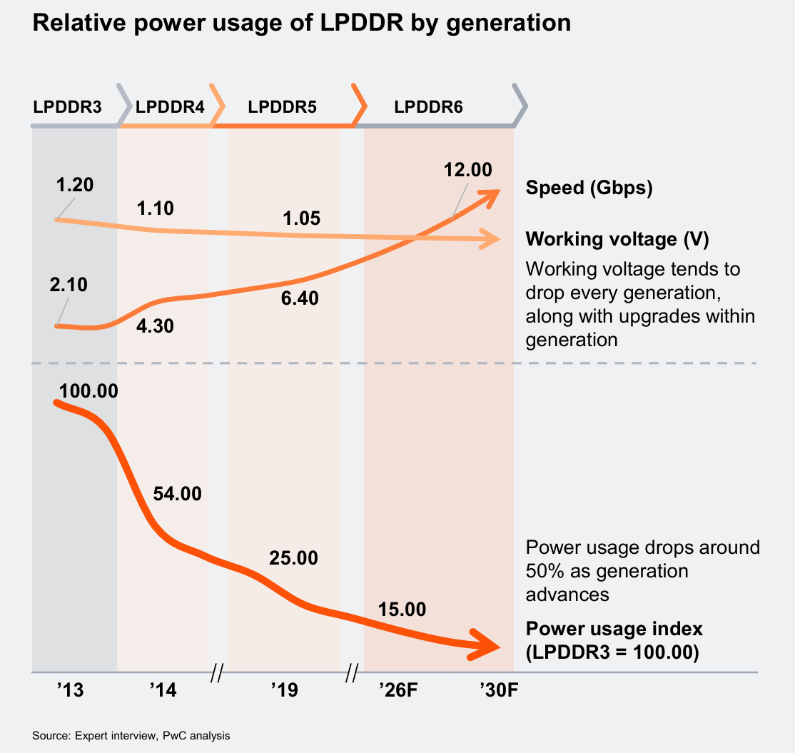 LPDDR 6 (ожидается в 2026 году) сможет обеспечить примерно на 50% меньшее энергопотребление по сравнению с LPDDR 5, а дополнительные улучшения ожидаются к 2030 году.