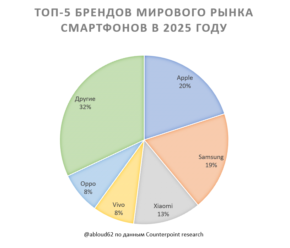 Топ-5 глобального рынка смартфонов. Apple лидирует на мировом рынке смартфонов с долей 20% в 2025 году