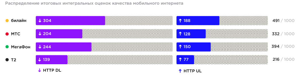 По совокупности показателей качества мобильного интернета Билайн показал лучший результат среди операторов. Сеть оператора демонстрирует высокую стабильность: доля успешных интернет-сессий составила 99,65%, что является лучшим показателем на рынке.