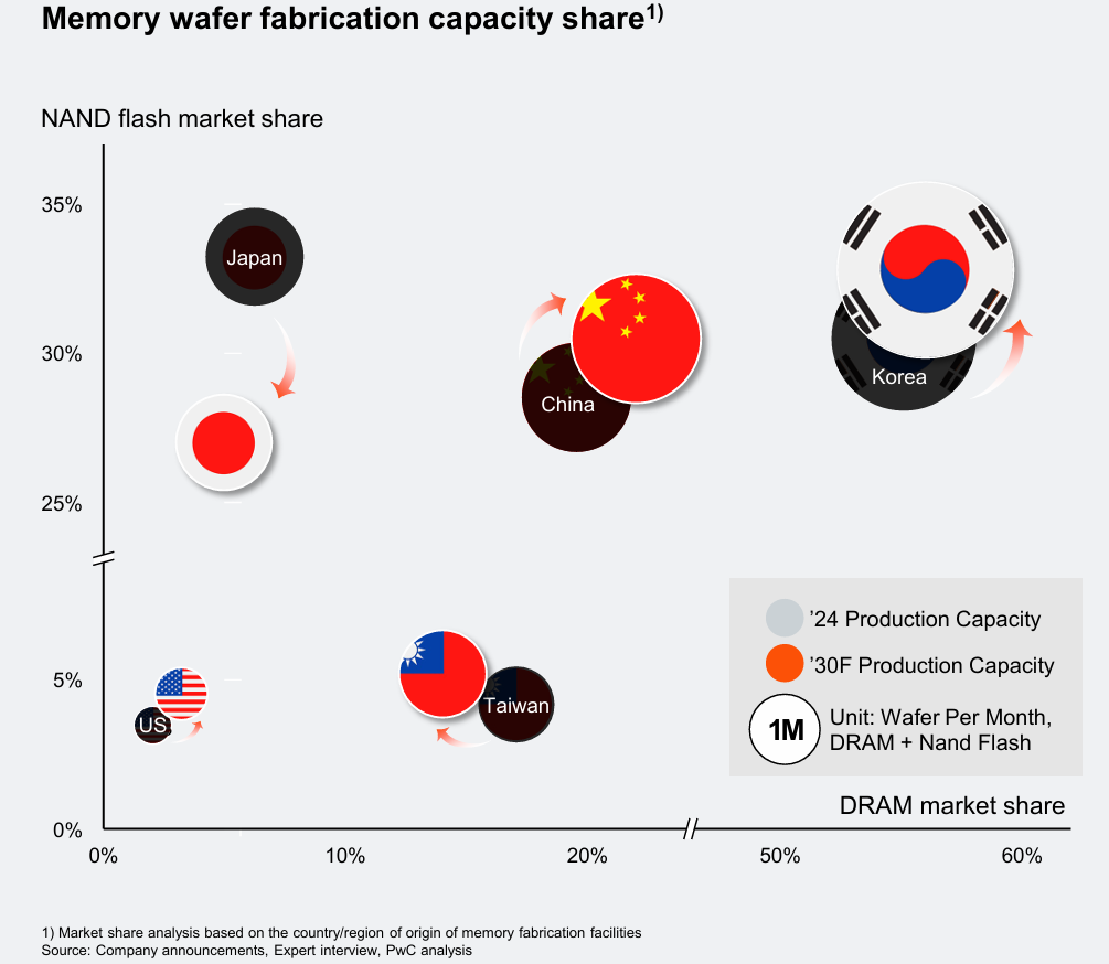 На картинке из отчета PwC показаны оценки доли рынка и прогнозы долей рынка Топ-5 стран, производящих полупроводниковую память,