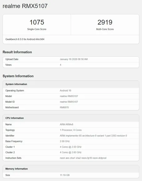 Согласно данным Geekbench модель с индексом RMX5107 базируется на чипсете MediaTek Dimensity 7400. Конфигурация чипа (4 ядра по 2.0 ГГц + 4 ядра по 2.6 ГГц и графика Mali-G615 MC2) и результаты тестов (1075 баллов в одноядерном и 2919 в многопоточном Geekbench 6.5) — это стандартная, но надёжная производительность для среднебюджетного сегмента.