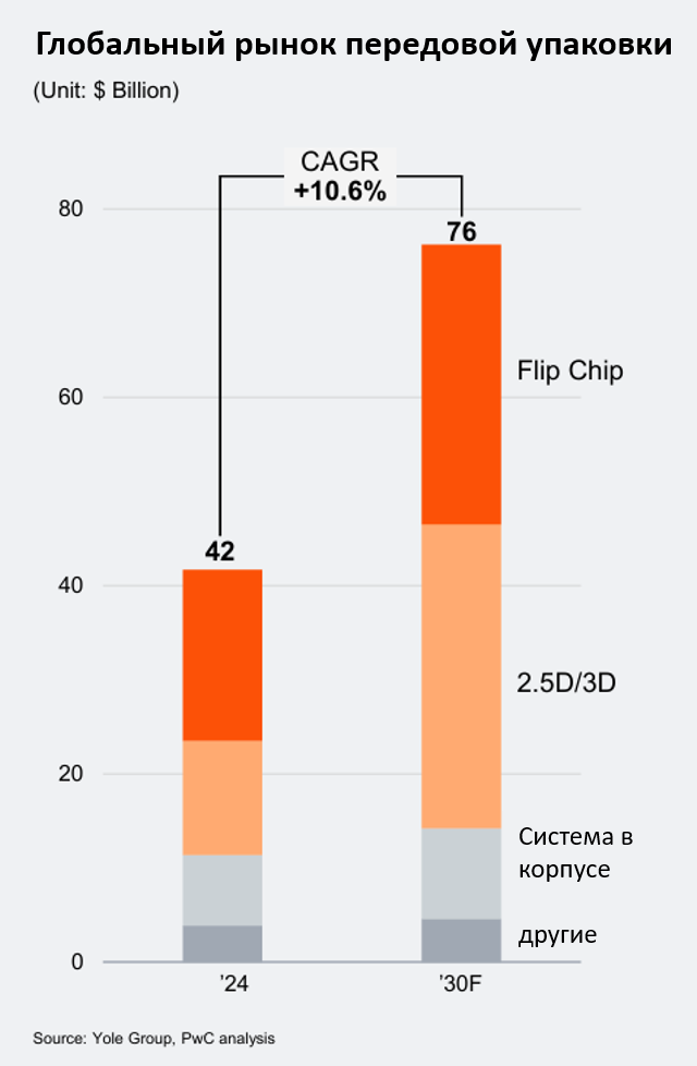Передовая упаковка в настоящее время является основным способом повышения производительности микросхем, однако переход к 3D-технологиям и чиплетная архитектура требуют повышения точности до уровня, используемого в производстве полупроводниковых структур на пластинах. В результате на долю контрактных и независимых производителе полупроводниковых пластин приходится до двух третей инвестиций в передовую упаковку.