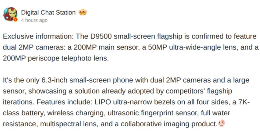 Oppo, кажется, решила переписать правила «гонки мегапикселей». Согласно данным авторитетного инсайдера Digital Chat Station, Find X9s станет уникальным экспериментом. Он станет первым флагманом на рынке, оснащённый двумя 200-мегапиксельными сенсорами в основной и перископной камерах.