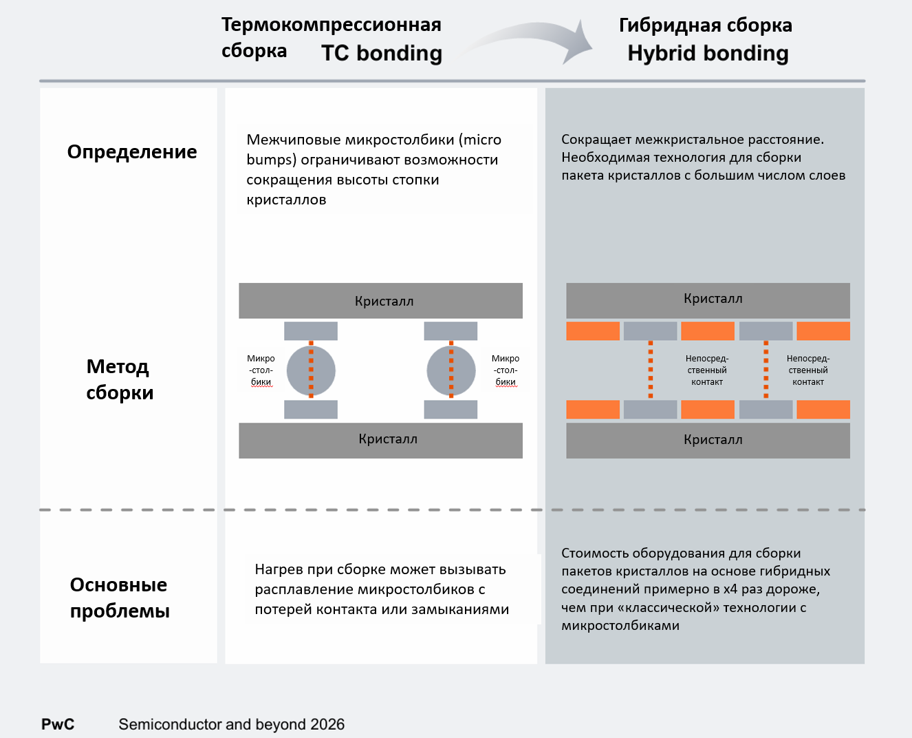 Традиционные методы термокомпрессионной сборки (thermo-compression bonding) полагаются на микропаяные соединения размером ~40 мкм, что ограничивает плотность ввода-вывода и увеличивает сопротивление по мере роста количества слоев. Гибридная сборка, напротив, создает прямые медно-медные (Cu-to-Cu, «медь к меди» контакты с шагом менее 10 мкм, обеспечивая более высокую пропускную способность и более плоскую структуру стека.