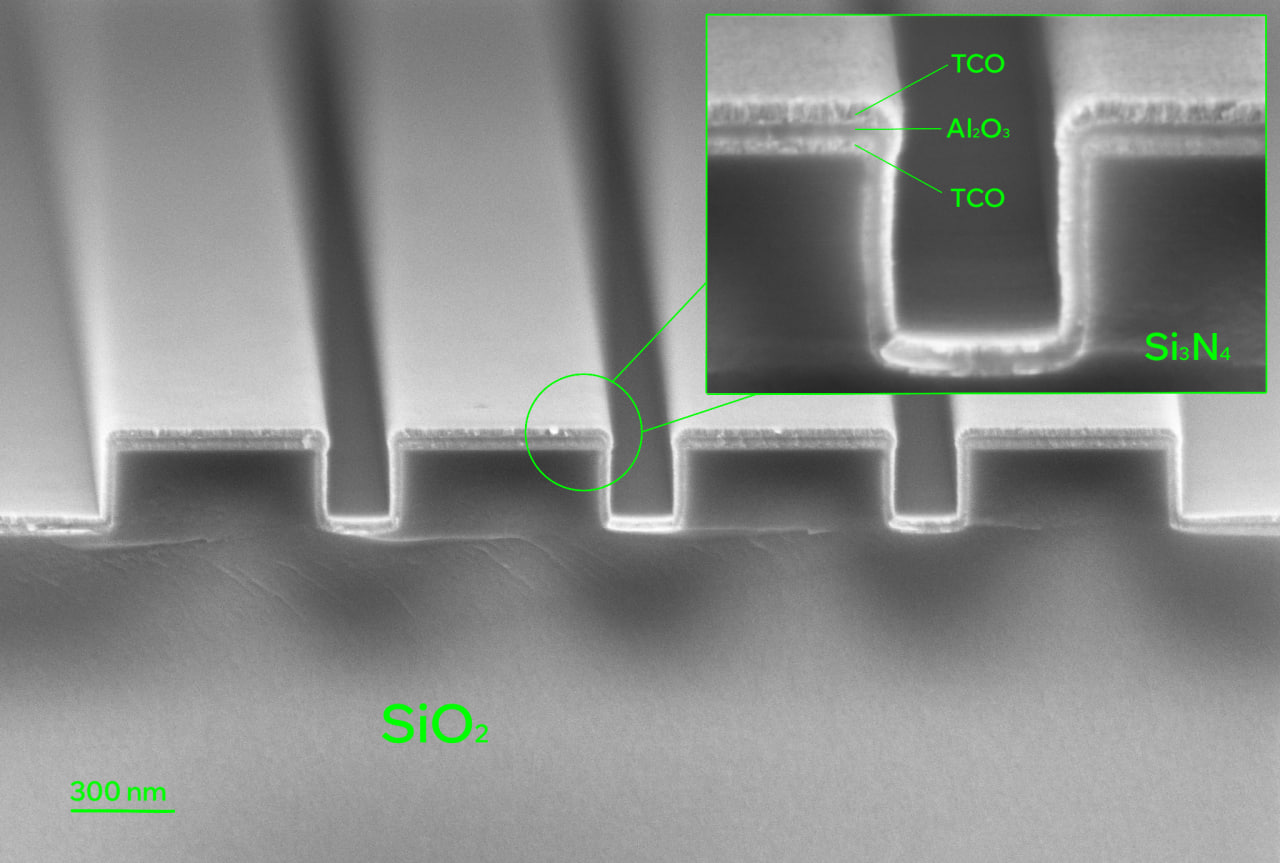 🔹 Использование активного слоя из прозрачного проводящего оксида (например, это может быть оксид индия-олова, ITO) толщиной 10-20нм. Этот материал демонстрирует (https://www.nature.com/articles/s41598-022-09973-5) выраженный электрооптический эффект: при подаче электрического потенциала изменяется концентрация свободных носителей заряда, что вызывает изменение оптических свойств материала, позволяя регулировать прохождение светового сигнала;