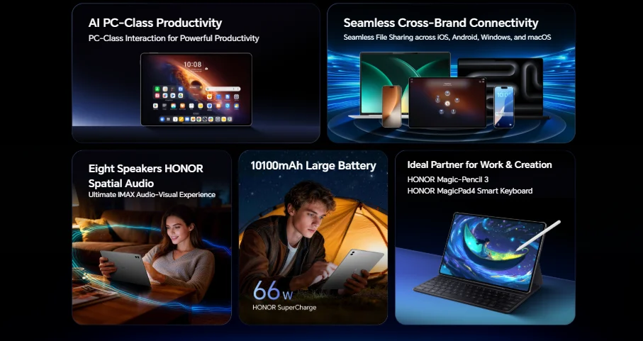 Honor продолжает развивать идею планшета как рабочего инструмента. MagicPad 4 поддерживает режим PC Mode, превращающий интерфейс в подобие десктопа с изменяемыми окнами. Стилус Pencil 3 и клавиатура продаются отдельно. Правда, клавиатура с трекпадом, которую показывали на MWC, в стартовых продажах отсутствует — только обычный чехол-клавиатура.
