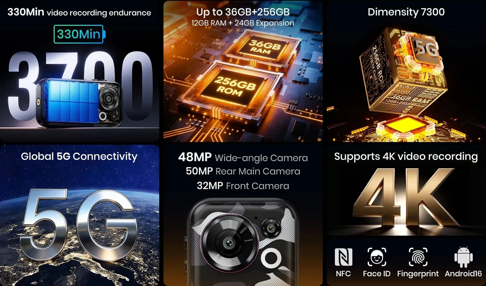 на 48 МП с углом обзора 152.6 градуса. FOSSiBOT явно метит в нишу экшн-камер: в комплекте есть крепление ¼ дюйма для установки на шлем, велосипед или штатив, а также выделенная кнопка спуска. Фронталка на 32 МП — для видеозвонков и селфи на привале.