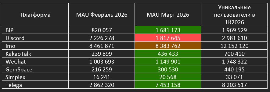 В целом спрос на альтернативные мессенджеры в России ожидаемо вырос на 50% за 1К2026. Telega показала +160% MAU в марте. Быстро рост BiP, прирост составил 105% за март. На 82% выросла аудитория KakaoTalk, на 39% - GemSpace, на 27% - Simplex. Выросло и пользование китайским WeChat - на 15%. Лидером по оттоку оказался заблокированный Discord - количество активных пользователей снизилось на 18%.