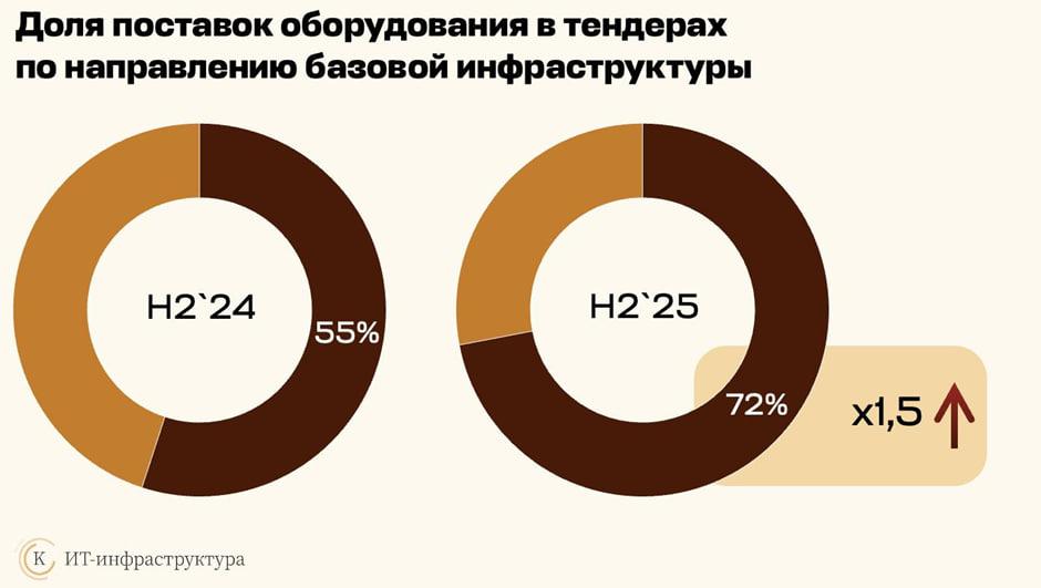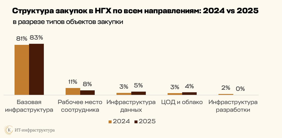 Их доля выросла с 81% в 2024 году до 83% в 2025 году, в то время как вложения в сегмент решений для рабочих мест пользователей сократился с 11% до 8%, а закупки по направлению инфраструктуры разработки практически исчезли из тендерных баз.