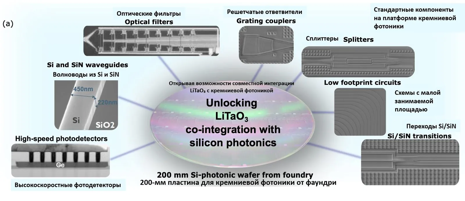 Это, прежде всего, ниобат лития (LiNbO₃), исходя из его высокого электрооптического сопротивления. Впрочем, интересен и танталат лития (LiTaO₃) - стабильный материал, прозрачный в УФ-диапазоне и термостойкий. Наличие лития в каждом из этих материалов затрудняет их стыковку со стандартными КМОП. В частности, традиционный бондинг пластин при работе с этими материалами считается неэффективным, приходится удалять много материала, пост-бондинговых операций много, они трудоемки.