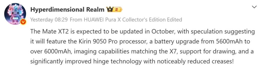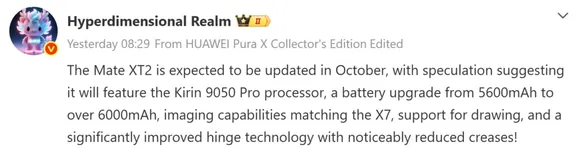 Согласно китайскому инсайдеру Hyperdimensional Realm, Huawei Mate XT 2 может выйти в октябре этого года. Устройство, как сообщается, дебютирует вместе с серией Mate 90 в Китае. Если график окажется точным, Huawei будет придерживаться графика выпуска, похожего на более ранние тройные складные модели.
